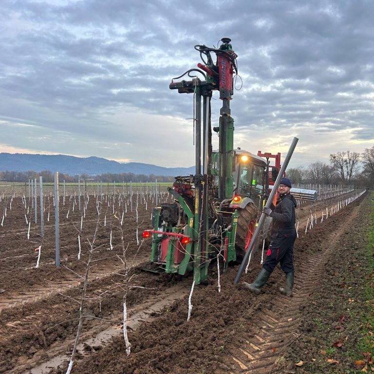 Neben dem präzisen Pflanzen übernehmen wir auch das fachgerechte Setzen und Drücken von Pfählen, die für Stabilität, gesundes Wachstum und langfristige Erträge entscheidend sind. So schaffen wir die optimale Grundlage für Ihre Kulturen – egal ob Neuanlage, Erweiterung oder Umstellung bestehender Flächen.